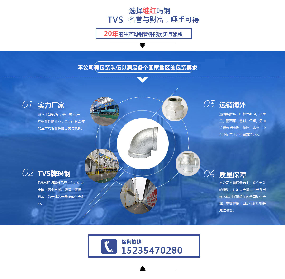太谷繼紅瑪鋼鑄造有限責(zé)任公司座落于山西省太谷縣胡村瑪鋼工業(yè)園區(qū),成立于1997年,是一家專(zhuān)業(yè)生產(chǎn)瑪鋼管件的企業(yè),至今已有20年的生產(chǎn)瑪鋼管件的歷史與累積。其中,本公司在出口外貿(mào)瑪鋼管件方面尤其專(zhuān)業(yè)并具有相當(dāng)大的優(yōu)勢(shì),長(zhǎng)年生產(chǎn)的德標(biāo)管件、美標(biāo)管件、英標(biāo)管件遠(yuǎn)銷(xiāo)俄羅斯、哈薩克斯坦、烏克蘭、墨西哥、智利、伊朗、孟加拉等包括歐洲、美洲、非洲、中東亞的二十幾個(gè)國(guó)家和地區(qū).....